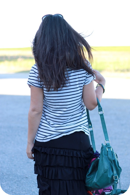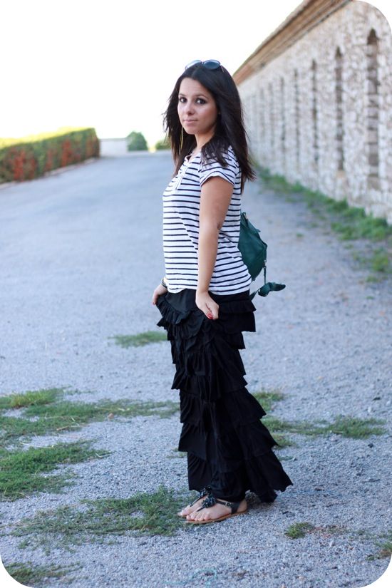 Magnifique cette jupe! Bonne idée de la porter avec marinière et sac cartable vert!