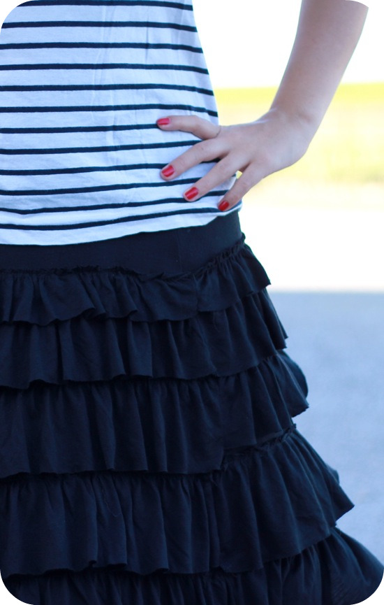 Cette tenue ne te met pas vraiment en valeur. Je pense que c’est peut-être too much des volants avec un t-shirt à rayures, j’aurais bien vu un haut plus simple et plus moulant.