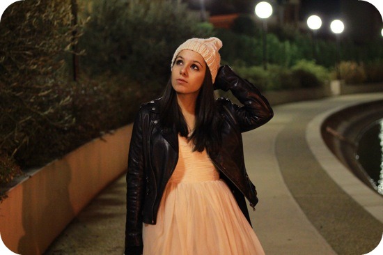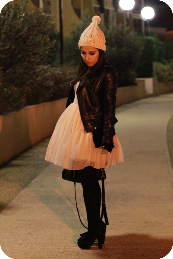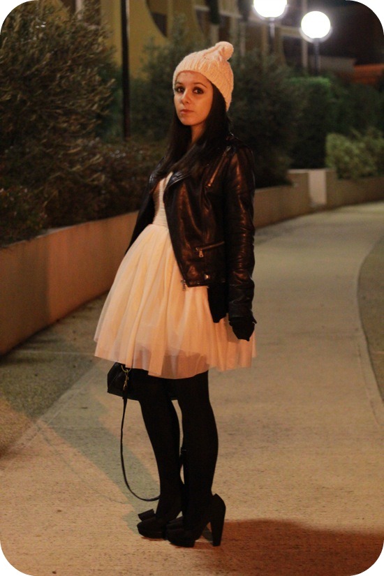 J’aime bcp l’association robe tutu avec le perfecto qui casse un peu le tout, mais par contre je n’aurais pas mis ce genre de bonnet avec ^^