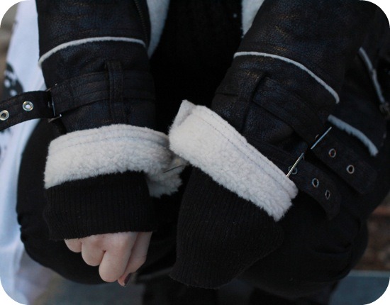 J’ai bien senti que si je continuais à faire ma maline en me baladant en jupette et cape, j’allais choper la grippe du siècle et puis… j’en avais un peu marre de grelotter et de répéter « J’ai froiiiiiiiid, j’ai froiiiiiiid! » donc un pantalon, des chaussettes, un snood et un bon bombardier se sont imposés!
