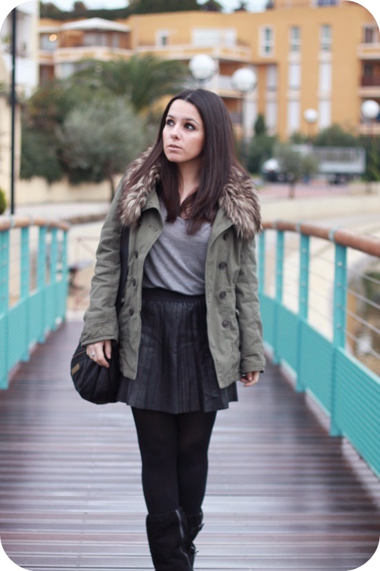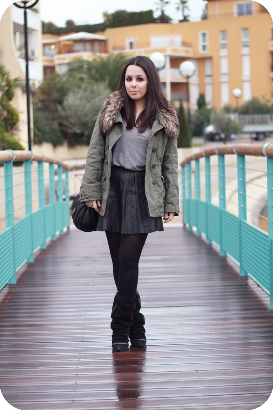 Le mix kakicuirfourrure est très réussi! Cette tenue est très mode, j’aime!