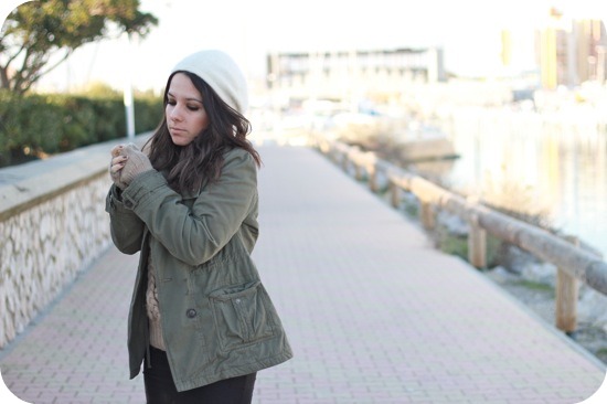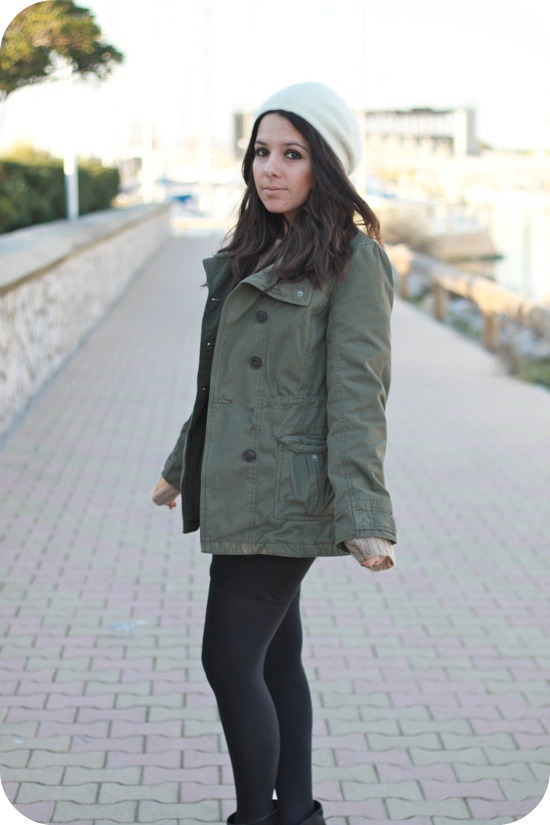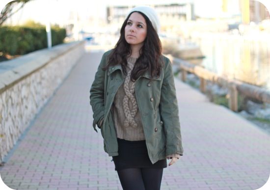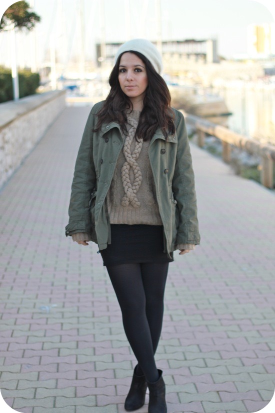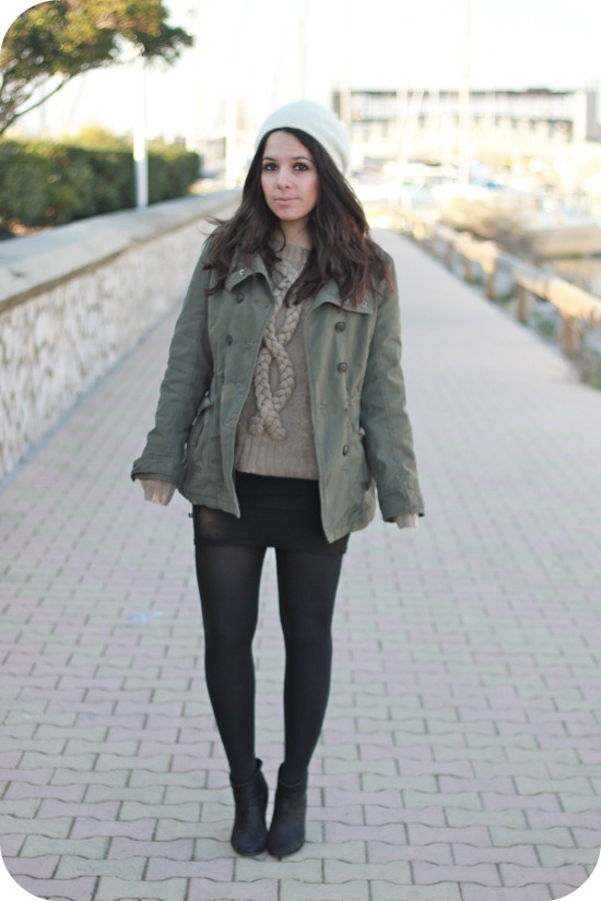 Je suis en adoration devant les bonnets un peu rasta. J’aime beaucoup ce modèle qui est joliment mis en valeur par ton choix de couleur, kaki, noir,camel. Et ce petit esprit militaire + la touche de féminité minimale (mini noire+ boots noires) créent des contrastes intéressants. Tout ça pour dire que tu portes une très jolie tenue.