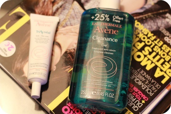 Elle me donne le gel nettoyant Avène sans savon pour peaux à problèmes et un soin Triacnéal.