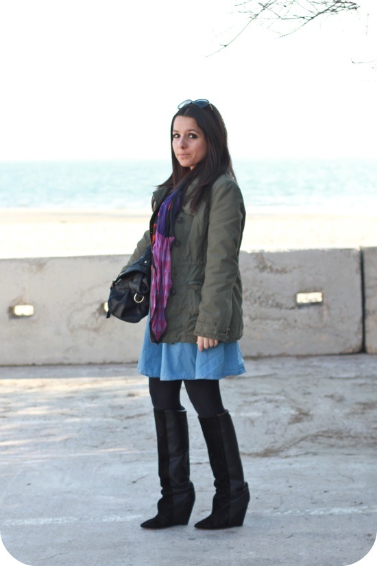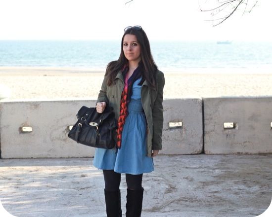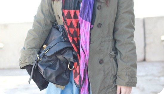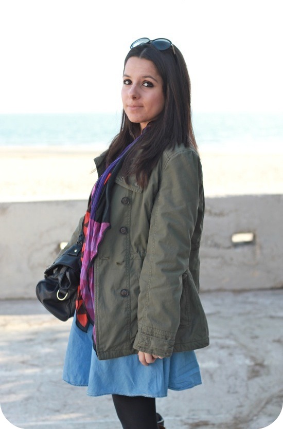 Les couleurs de ton foulard rendent super bien avec l’effet jean et le kaki.
