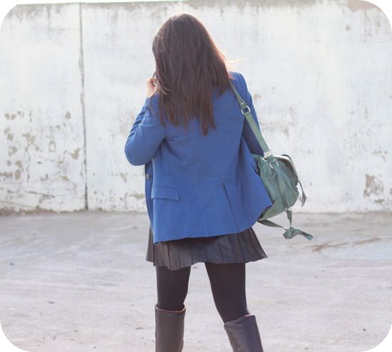 J’adore ce look, surtout le bleu du blazer, et la jupette tout cuir ! topissime !