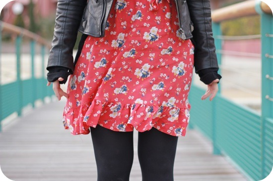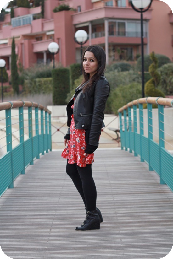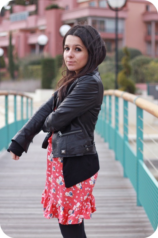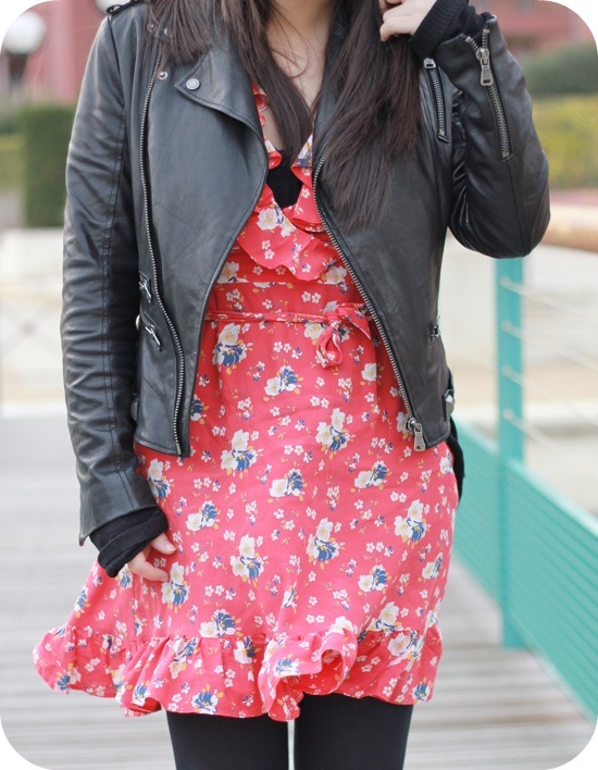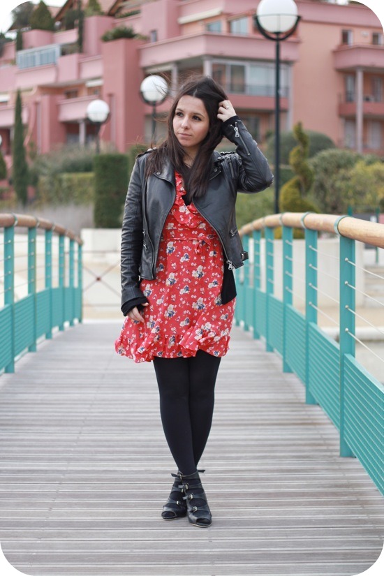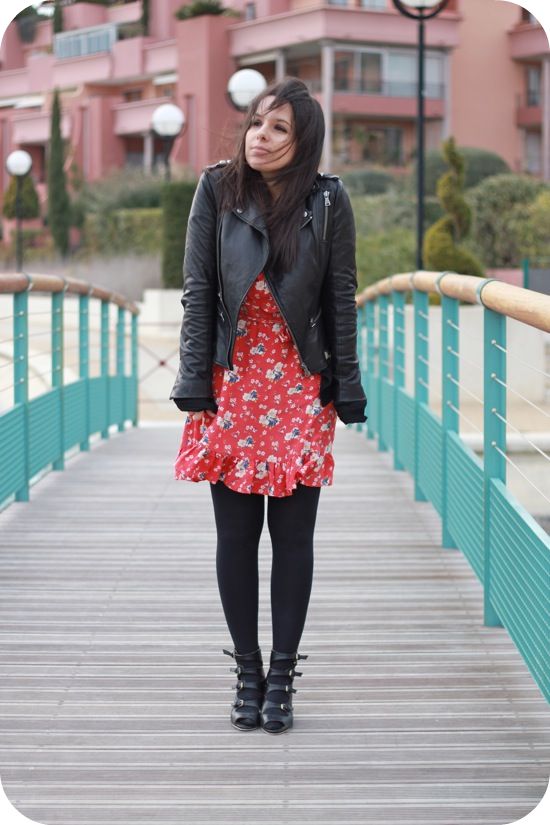 J’aime bien le cuir noir pour casser le côté petite fille de la jolie robe rouge à fleurs!