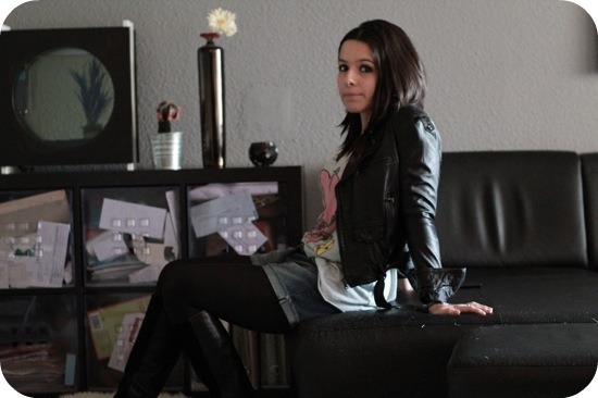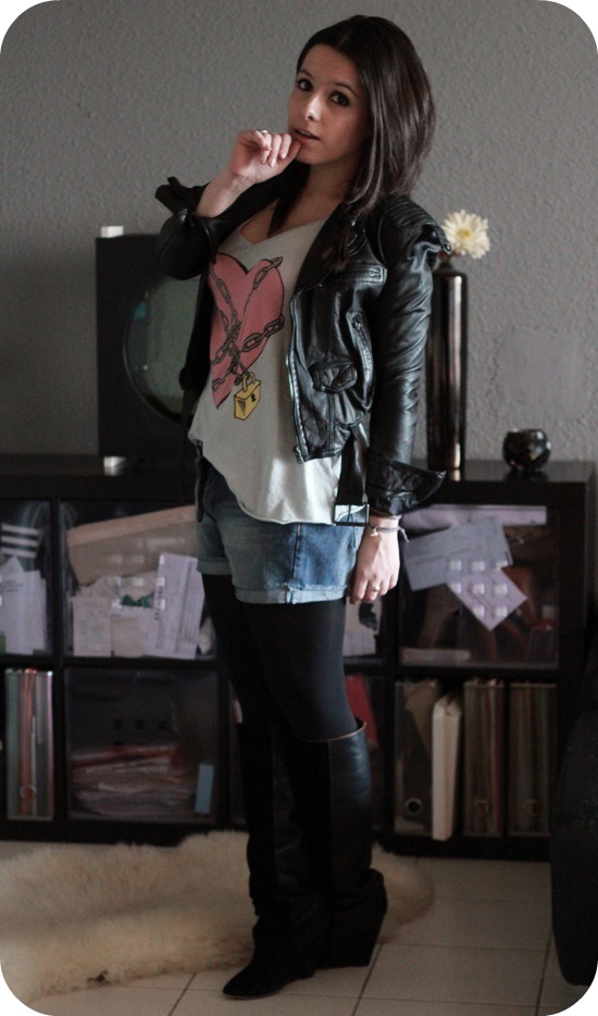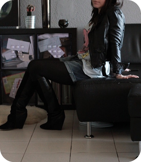 ces bottes sont fabuleuses!! tu dois faire des jalouses sur ton passage!! 😉 et ce tshirt bien rock bien sympa!!!