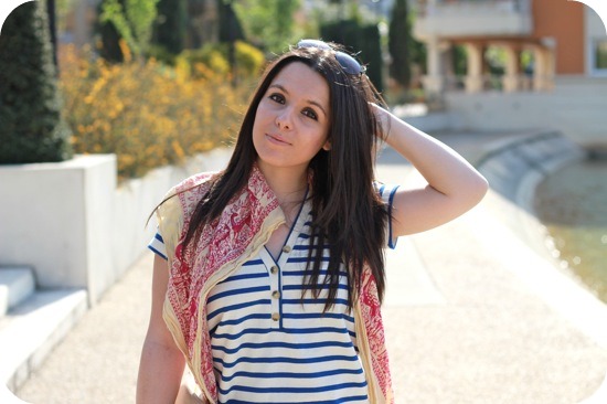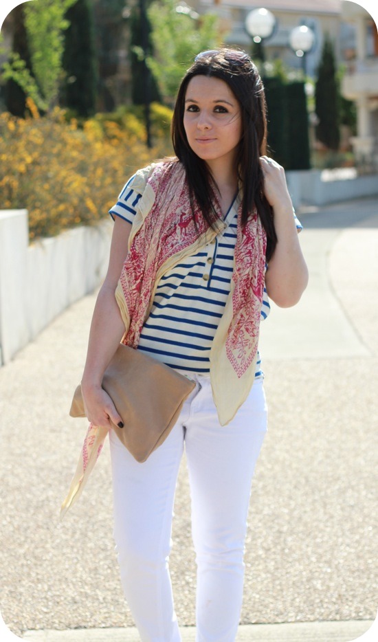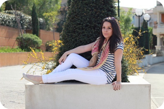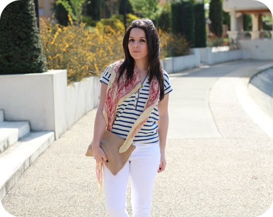Oooh c’est joli ^^ Moi aussi je suis fan des jeans blancs…l’été c’est parfait. Et avec ta marinière et ton ptit foulard, c’est parfait! Bisous miss