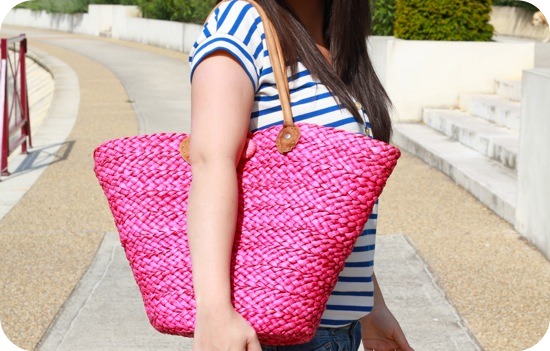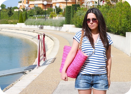 J’ai donc sorti mon petit panier tressé de mamie (dixit l’Homme), rose (non, ma pinkiguite ne m’a toujours pas quittée), mes nouvelles sandales/espadrilles Castaner, un petit short, une marinière et me voilà prête à aller me dorer la pilule à la plage! (Soit dit en passant, vous noterez que j’ai pris des couleurs!)