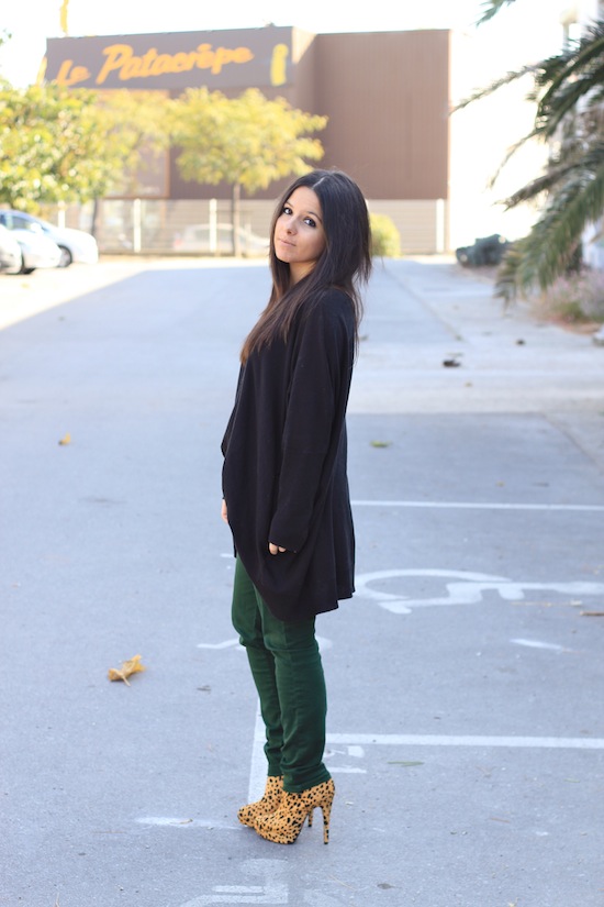 Pour adoucir le mix talon de 12 x léopard, un bon gros pull loose chauve souris et j’évite l’effet « tapineuse de service » (enfin… je crois).