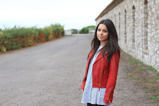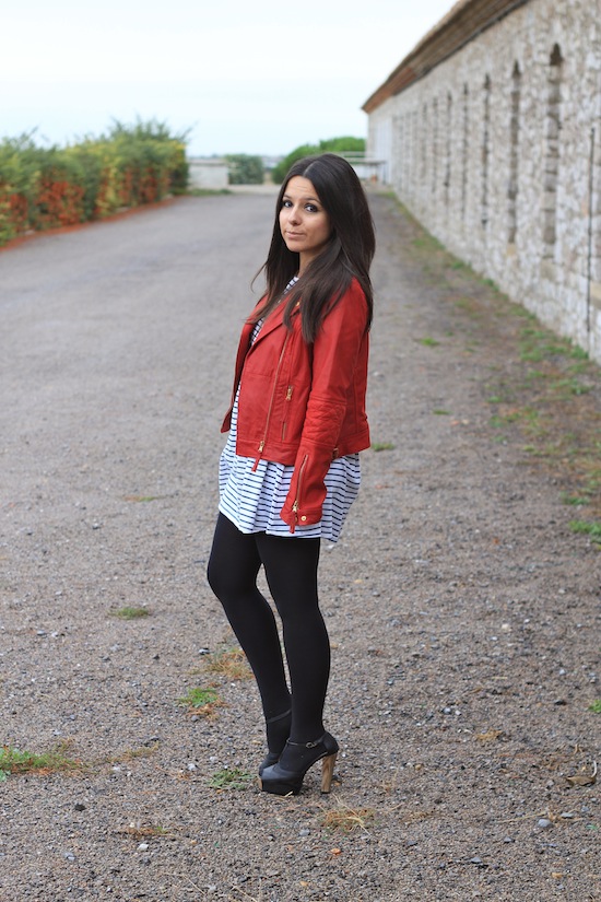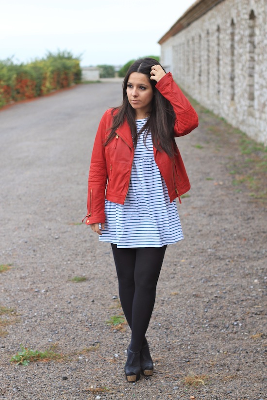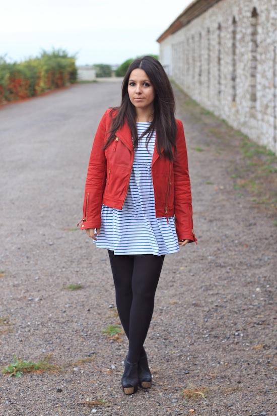 J’aime beaucoup ton perfecto rouge!! mais j’aime pas trop les collants opaques avec ce genre de robe^^