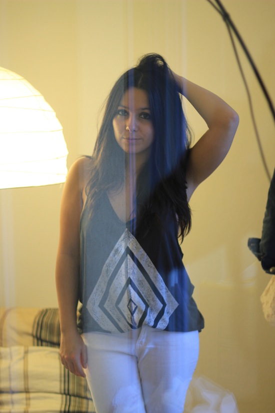 Je trouve les photos très réussie en intérieur, je ne pense pas pouvoir faire mieux ! Le pantalon blanc te va bien et le t-shirt est vraiment canon !