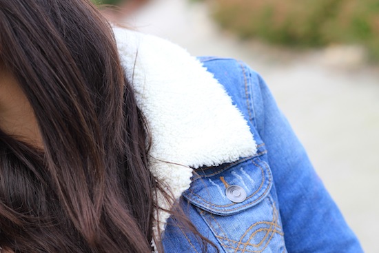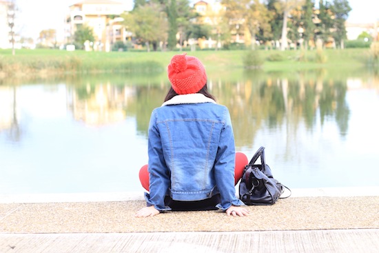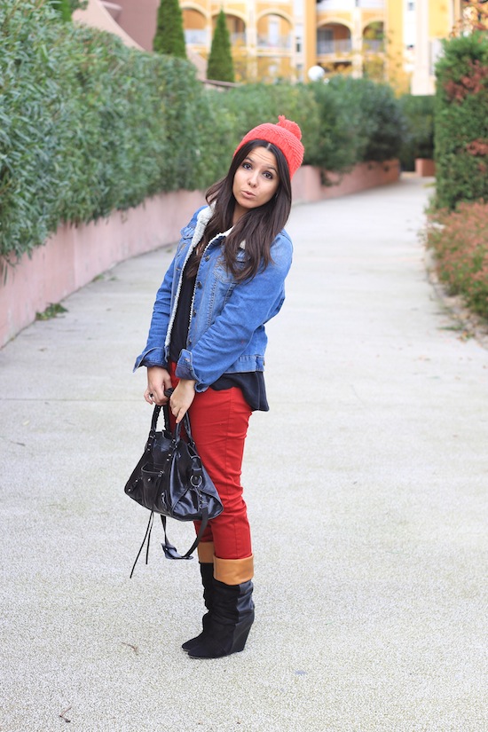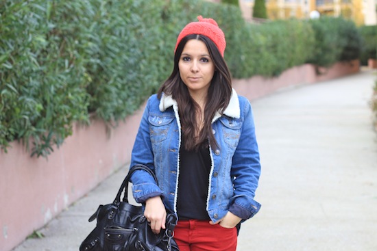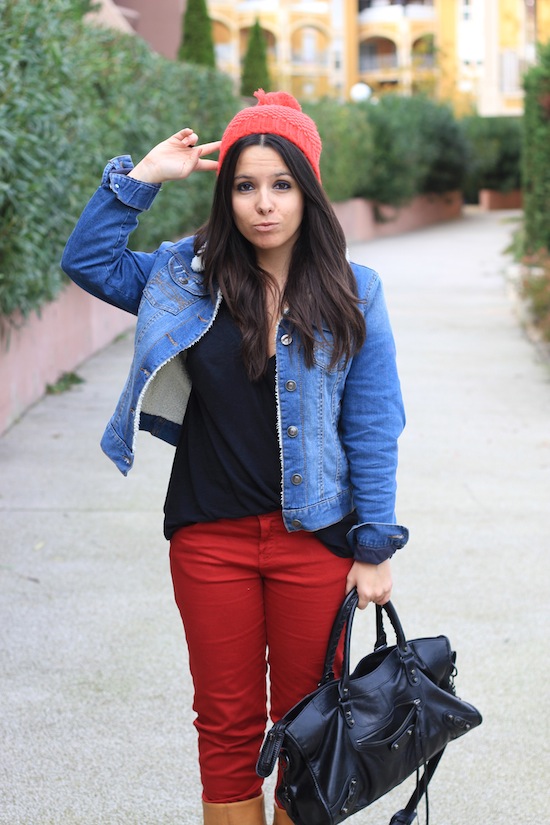 J’aime beaucoup l’association slim rouge et veste en jean.