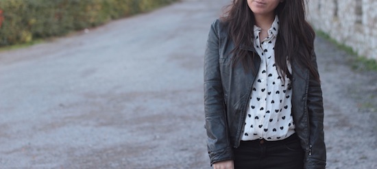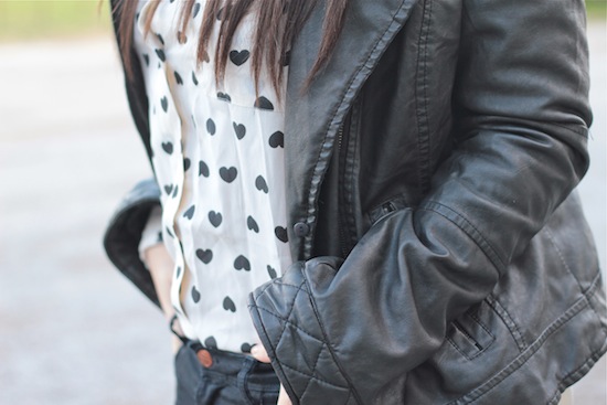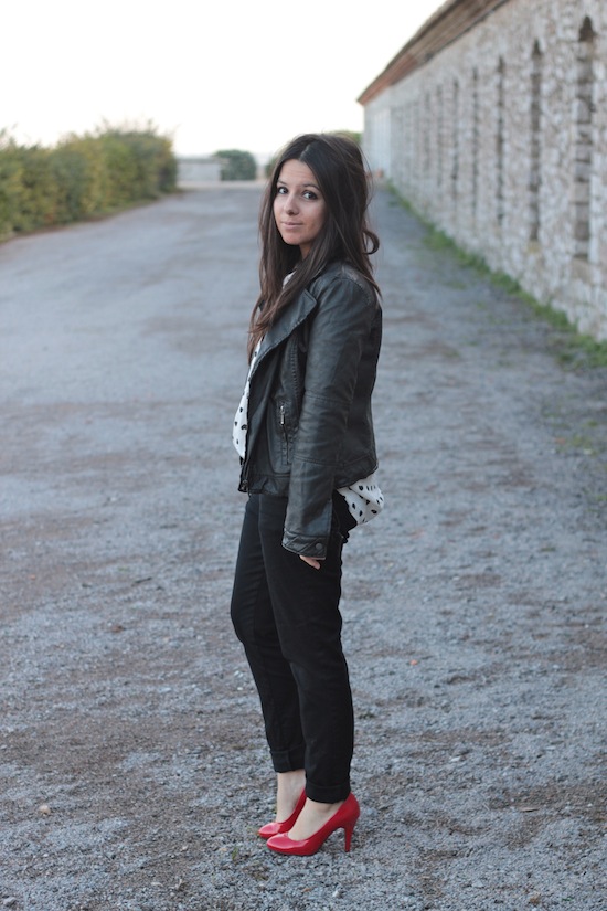 Ici par exemple, la chemise à cœurs très « petite fille », les escarpins rouges très « pin up » et le perfecto « rock » donnent un mélange assez sympa en fin de compte non? (merci, mes chevilles vont bien ^^).