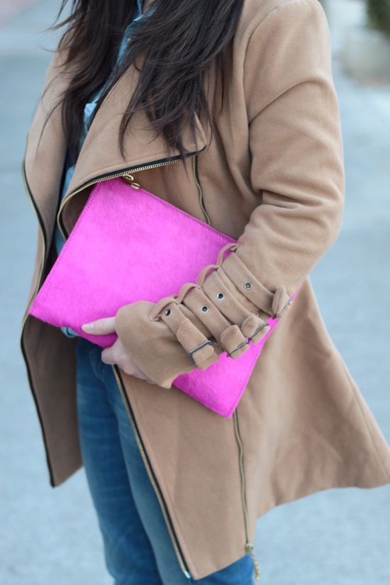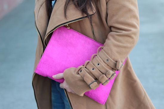 J’adore cette pochette rose « imitation poulain »! 😉 Mis avec ce manteau camel, ça donne un très joli résultat.