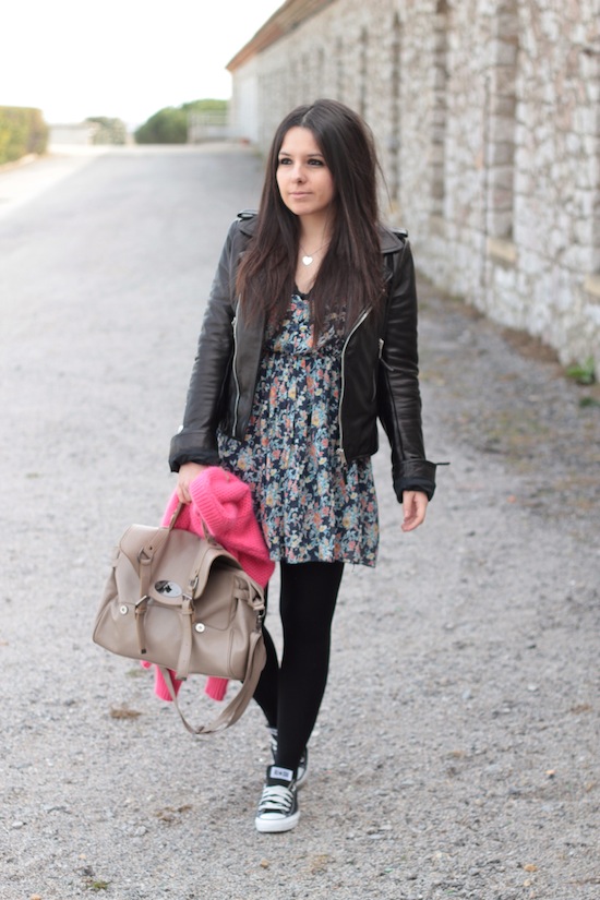 J’adhère à l’association perfecto/robe à fleurs, mais pas trop avec les Converse. Après si tu portes souvent des talons, je comprends que tu te sentes plus à l’aise à plat !