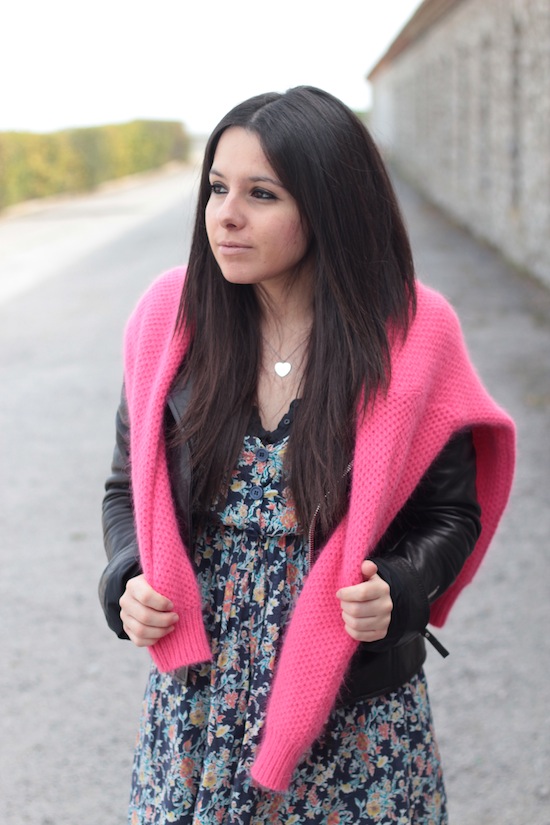 très jolie cette petite maille rose bonbon! la robe aussi, jadore ce look!