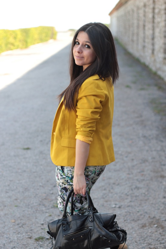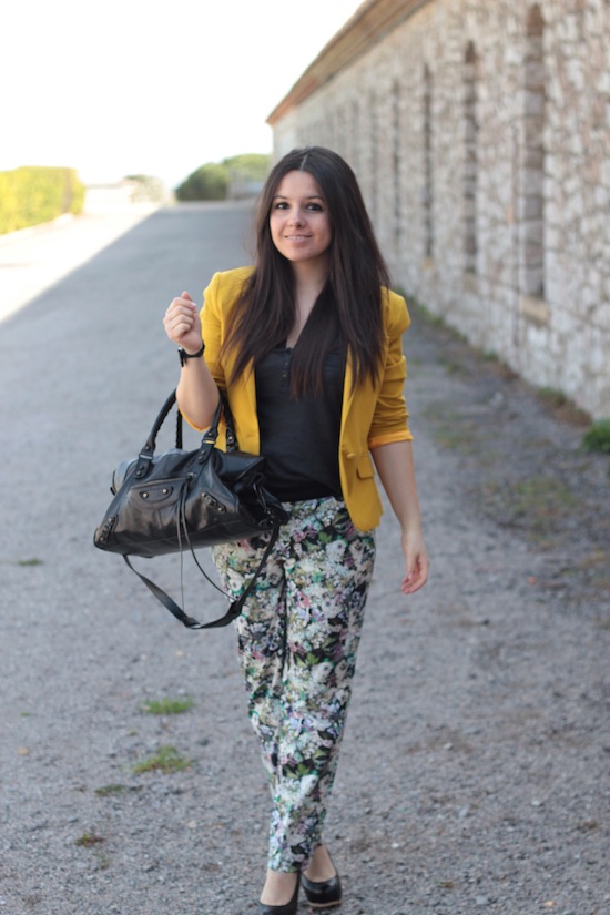 Tu portes très bien ce pantalon fleuri, et j’adore le blazer jaune!