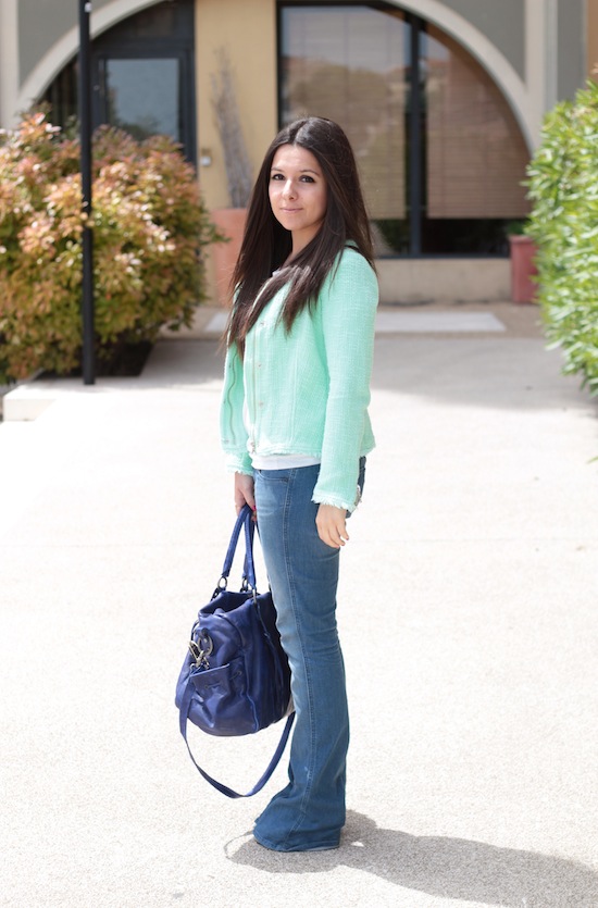 Toujours belle cette veste avec sa coupe et sa couleur. Ce pantalon t’allonge les jambes; je n’arrive pas à porter des talons, du coup, je ne peux pas porter de pantalons flares! 🙁 x