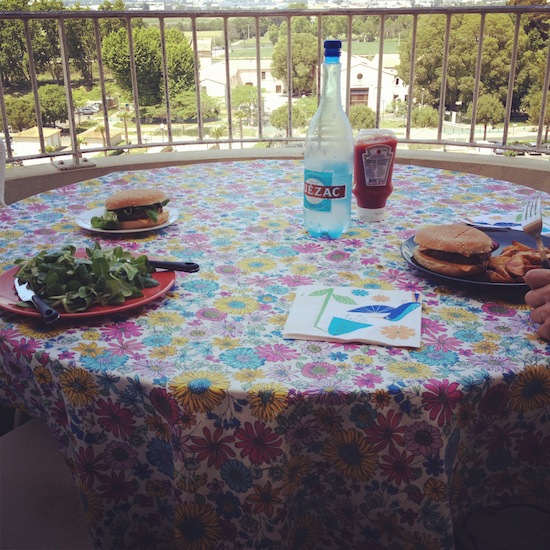 J’ai pris mon premier repas dehors sur ma jolie nappe « champêtre » que l’Homme déteste (il m’a même menacée de la jeter!)