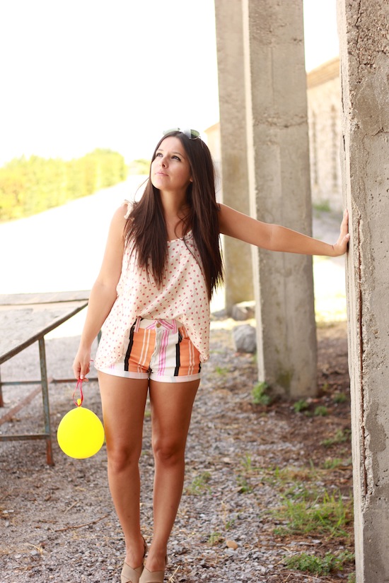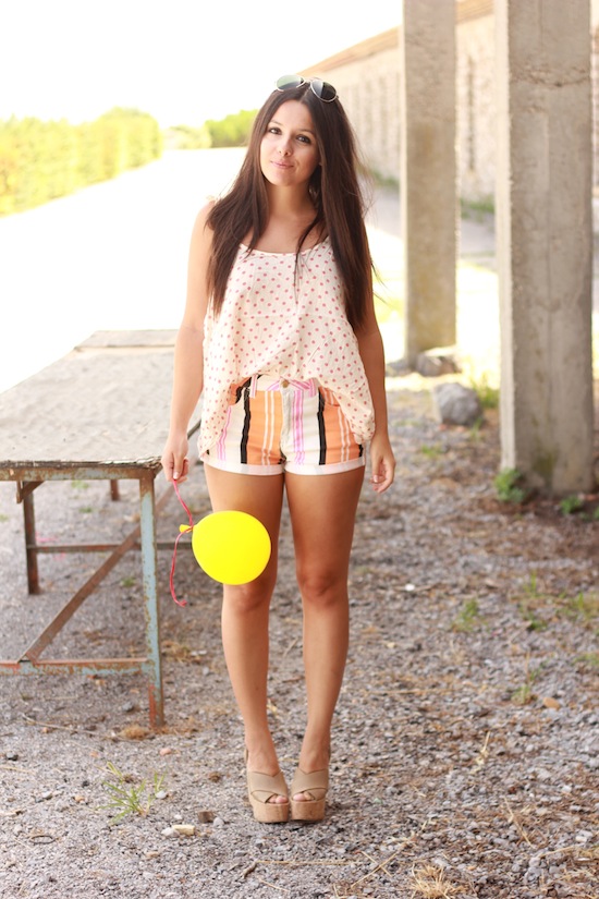 C’est sympa ta tenue avec cette touche de jaune ! Ton short est canon, j’aime beaucoup. Et pour les ballons à l’hélium, je pense que tu dois facilement en trouver dans les magasins de fêtes, farce & attrape, etc…