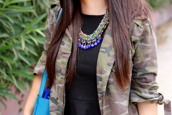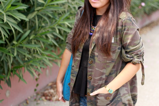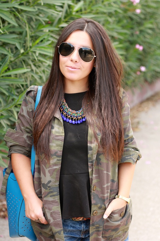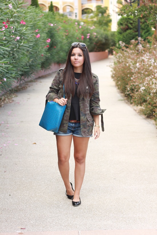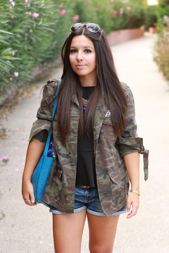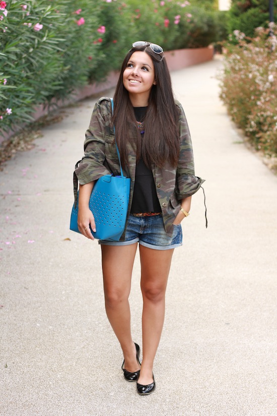 Très joli look, j’aime beaucoup l’association de la veste militaire avec le sac bleu azur ! Bonne journée !
