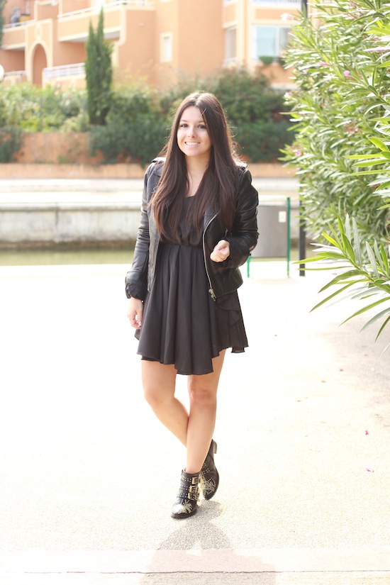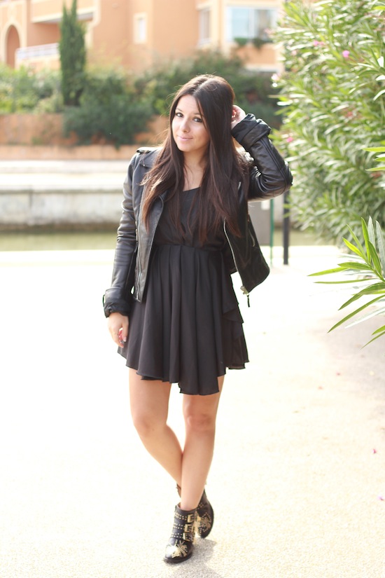 Très jolie look, j’aime beaucoup l’effet asymétrique de la robe, et ce perfecto est tout simplement divin ! Par contre, par encore convaincue par ces boots 😉 Bonne journée !