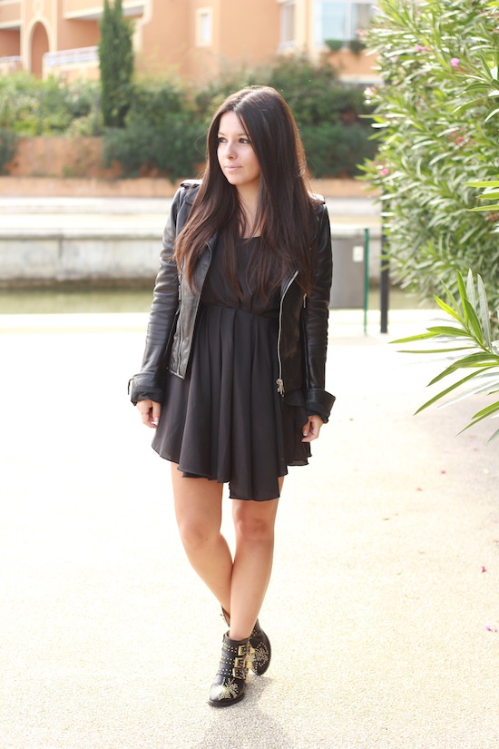 Je suis vraiment fan de la robe et du perfecto mais alors ces bottines qu’on voit à tous les pieds, c’est vraiment pas mon truc 🙁