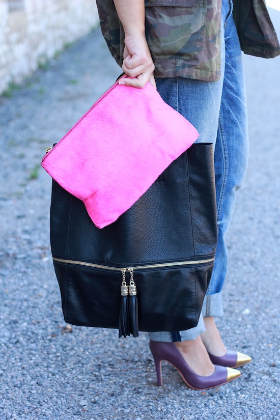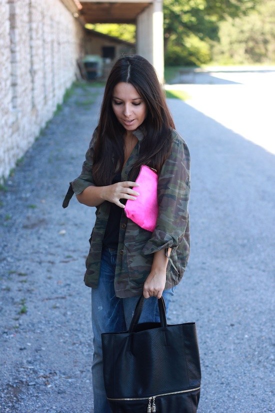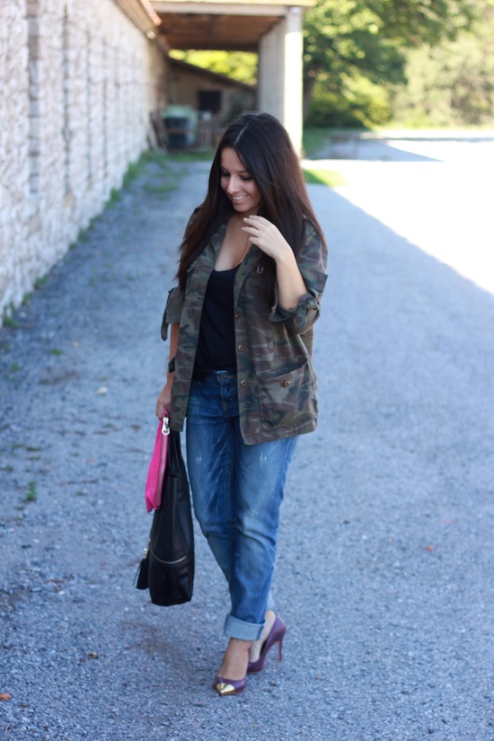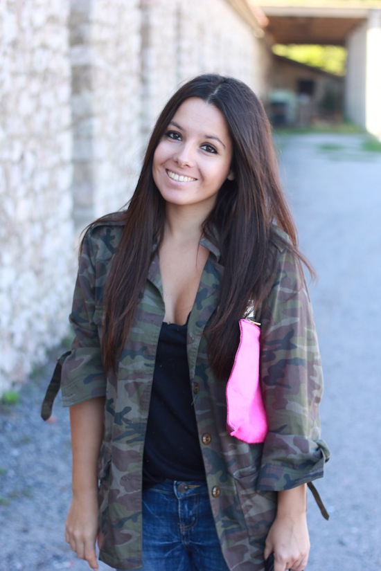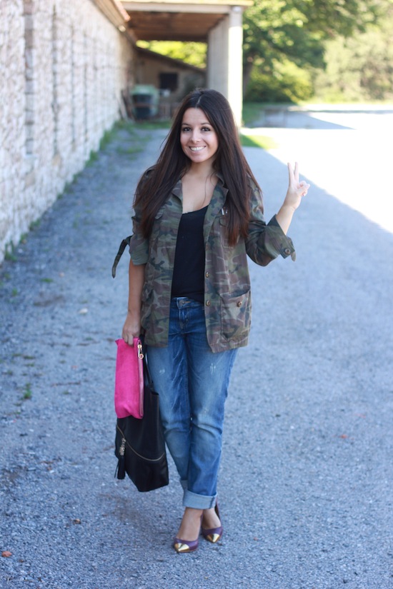 J’aime beaucoup cette tenue et surtout l’association de la veste militaire avec ces escarpins, ce jean boyfriend et la pochette fluo !! Un look pétant ! 😉 Bonne soirée !