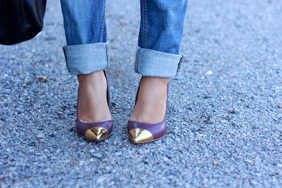 Qu’est ce que j’aime ces escarpins!! La couleur et le bout doré: superbe!! La jolie pochette rose et le sac j’adore!! La veste aussi! Enfin tout quoi!