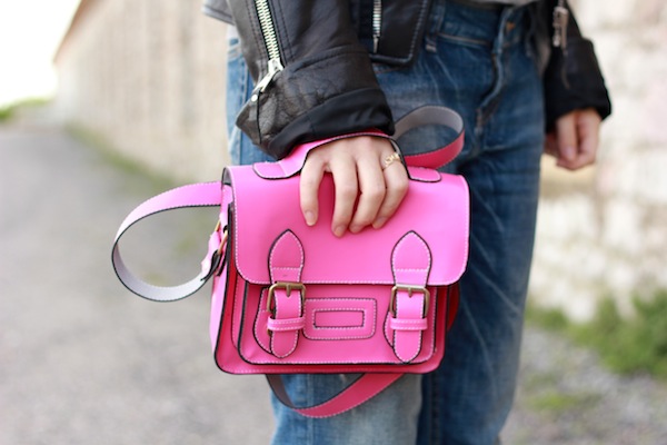 Ce mini-cartable rose et les escarpins sont tout juste parfaits avec cette tenue.