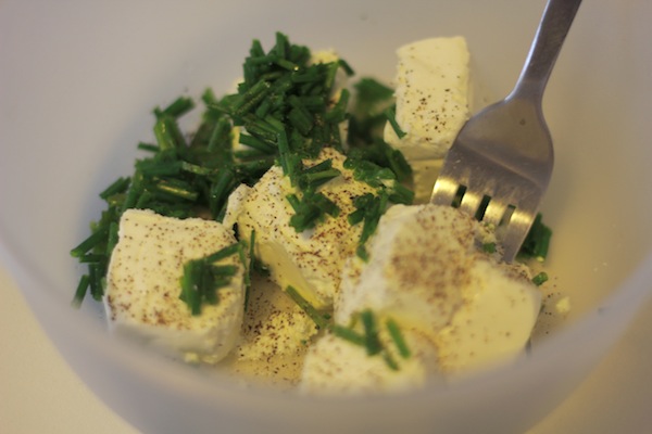 Mettez les carrés frais dans un récipient, coupez la ciboulette en petits morceaux et ajoutez là, terminez par le jus de citron, salez, poivrez et remuez bien le tout.